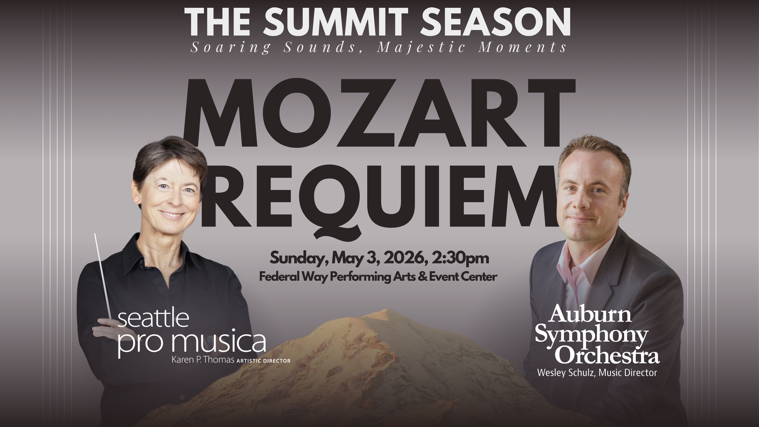 Join us at 1:30 PM for an illuminating pre-concert conversation with Auburn Symphony Music Director Wesley Schulz and Seattle Pro Musica Artistic Director Karen P. Thomas. These two visionary leaders will share their unique perspectives on the music, the collaboration, and the emotional landscape of Mozart’s Requiem and Golijov’s Oceana.